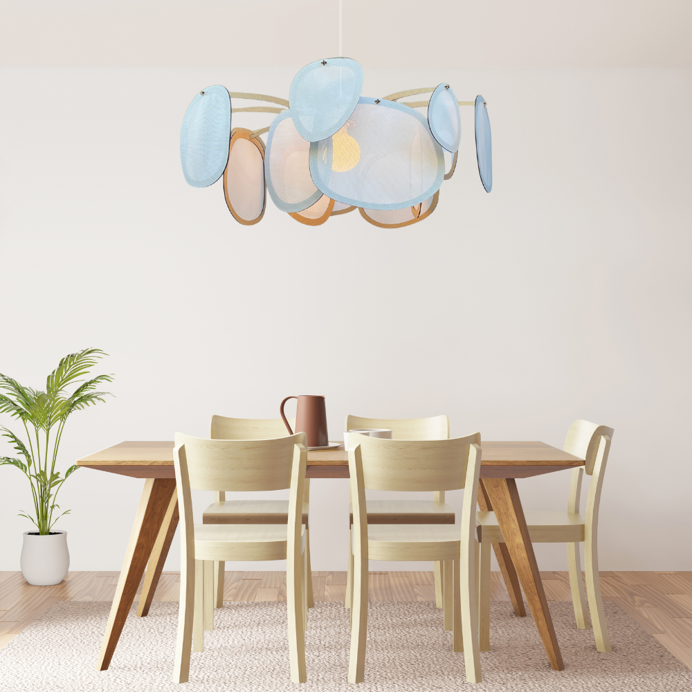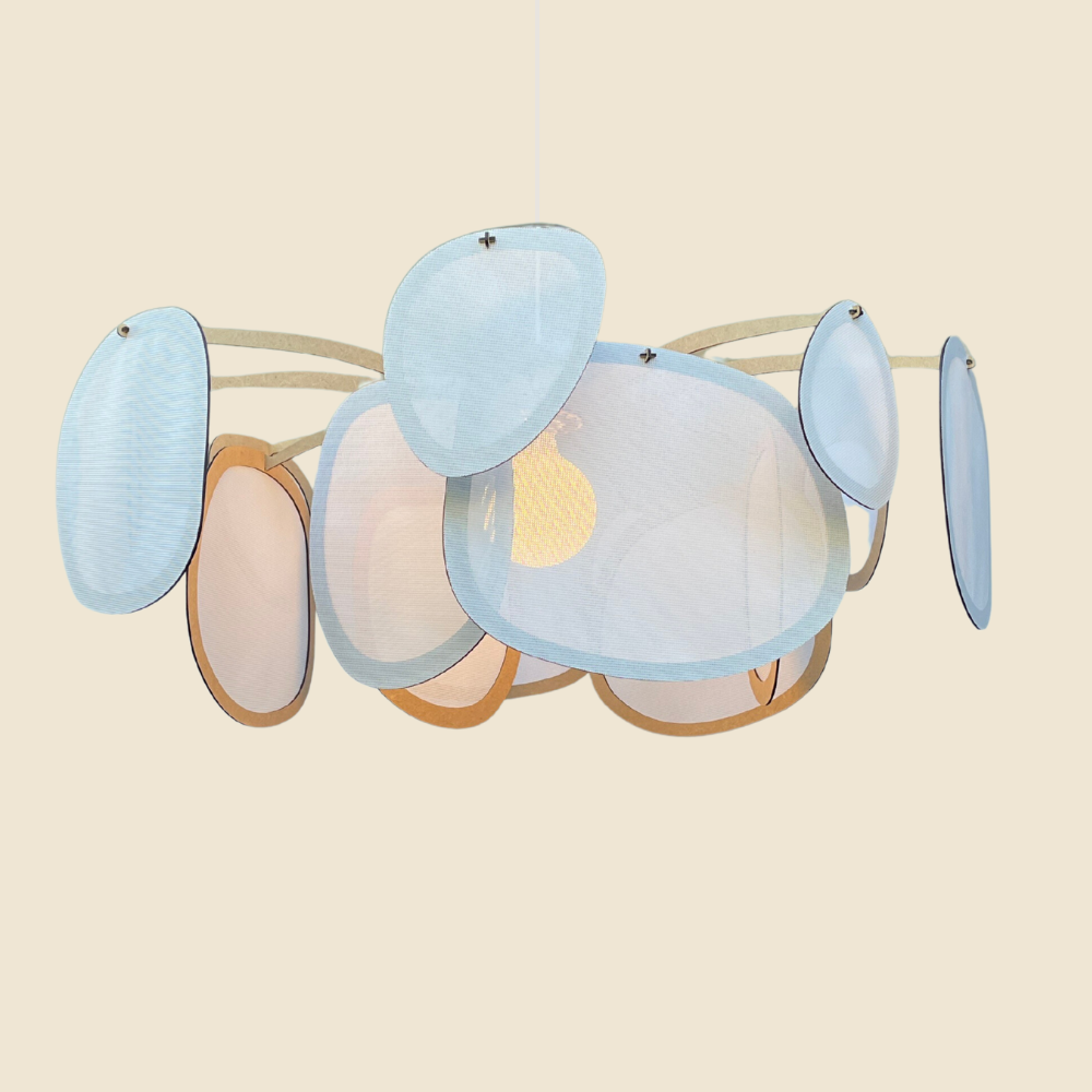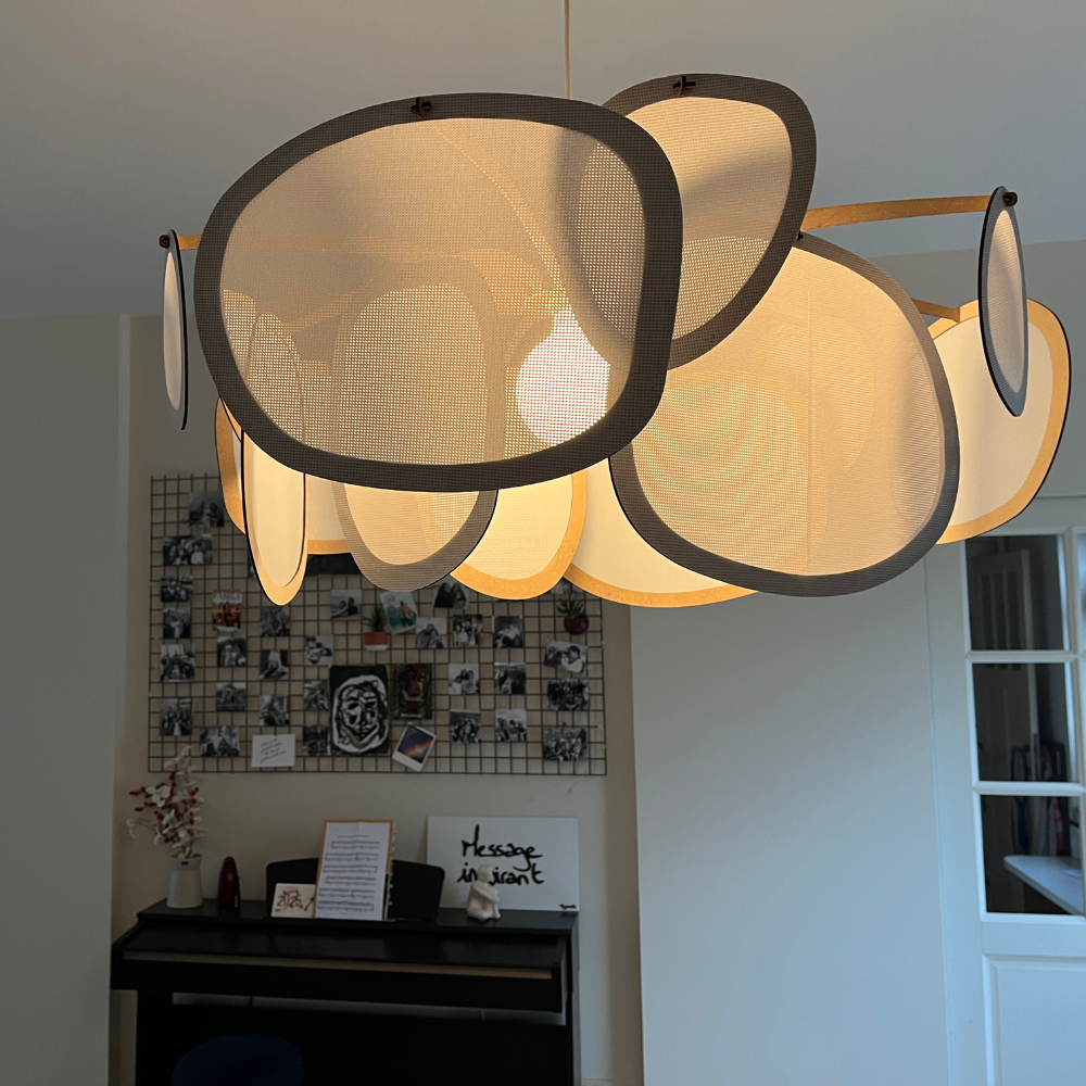 Entre sculpture et luminaire, elle diffuse une lumière douce et poétique, jouant avec la transparence et les textures du matériau.